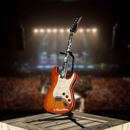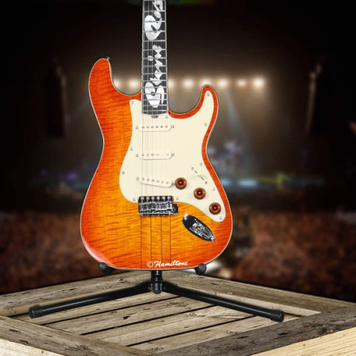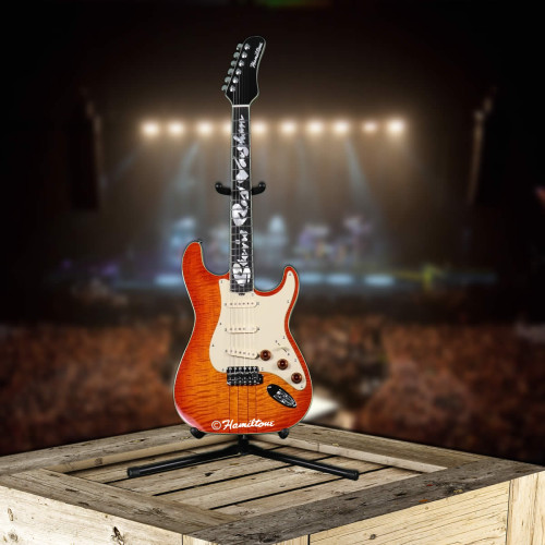 This Hamiltone Stevie Ray Vaughan edition guitar has an amber/orange style base with a cream colored pickguard and Stevie’s name inlaid in pearl into the neck. The neck through body construction is just like the original that was made for Stevie Ray Vaughan in 1984.