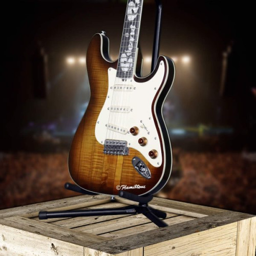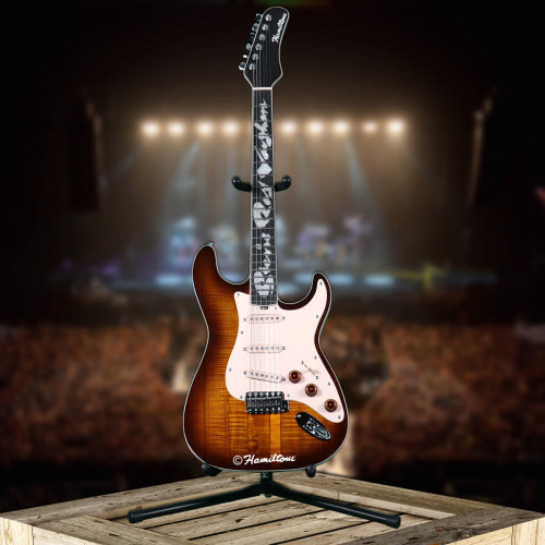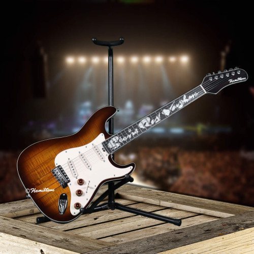 This Hamiltone Stevie Ray Vaughan edition guitar has a deep tobacco/amber style base with an off-white colored pickguard and Stevie’s name inlaid in pearl into the neck.  The neck through body construction is just like the orginal that was made for Stevie Ray Vaughan in 1984.  All Hamiltone guitars have hand-wound pickup.